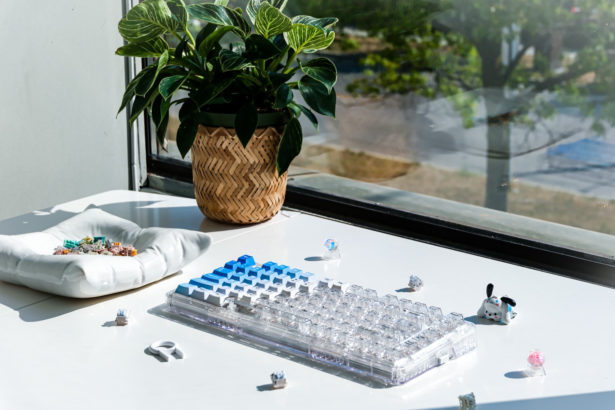 Frozen Starlight shines with a clean and modern aesthetic, combining transparency with a graceful touch of color. Most of the keys are crystal-clear to let RGB lighting glow freely, while the top-left corner features a smooth white-to-blue gradient, echoing the brilliance of light against the open sky. Elegant yet minimal, this design brings a sense of clarity and brilliance to your keyboard, making every keystroke feel luminous and inspiring.